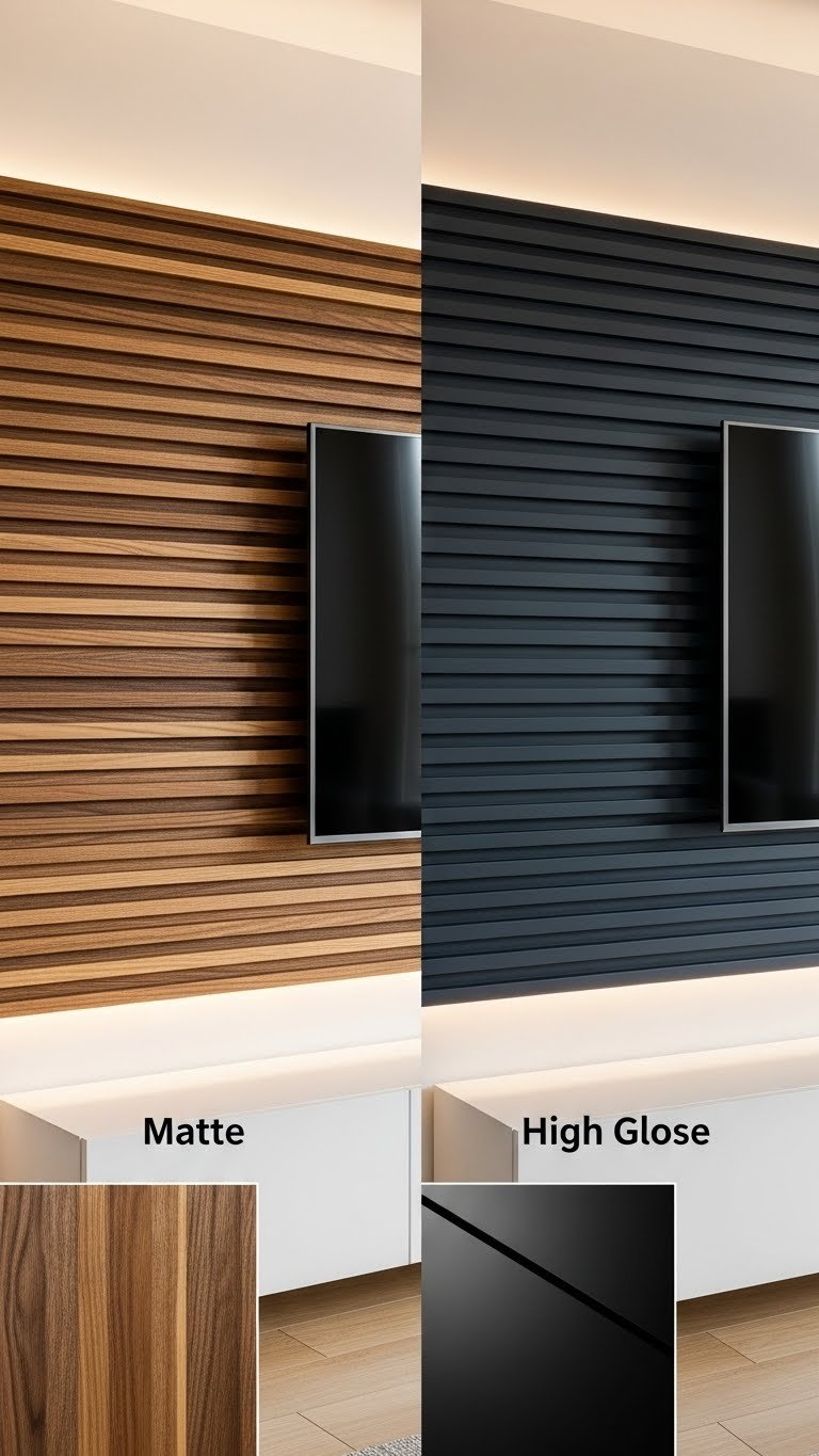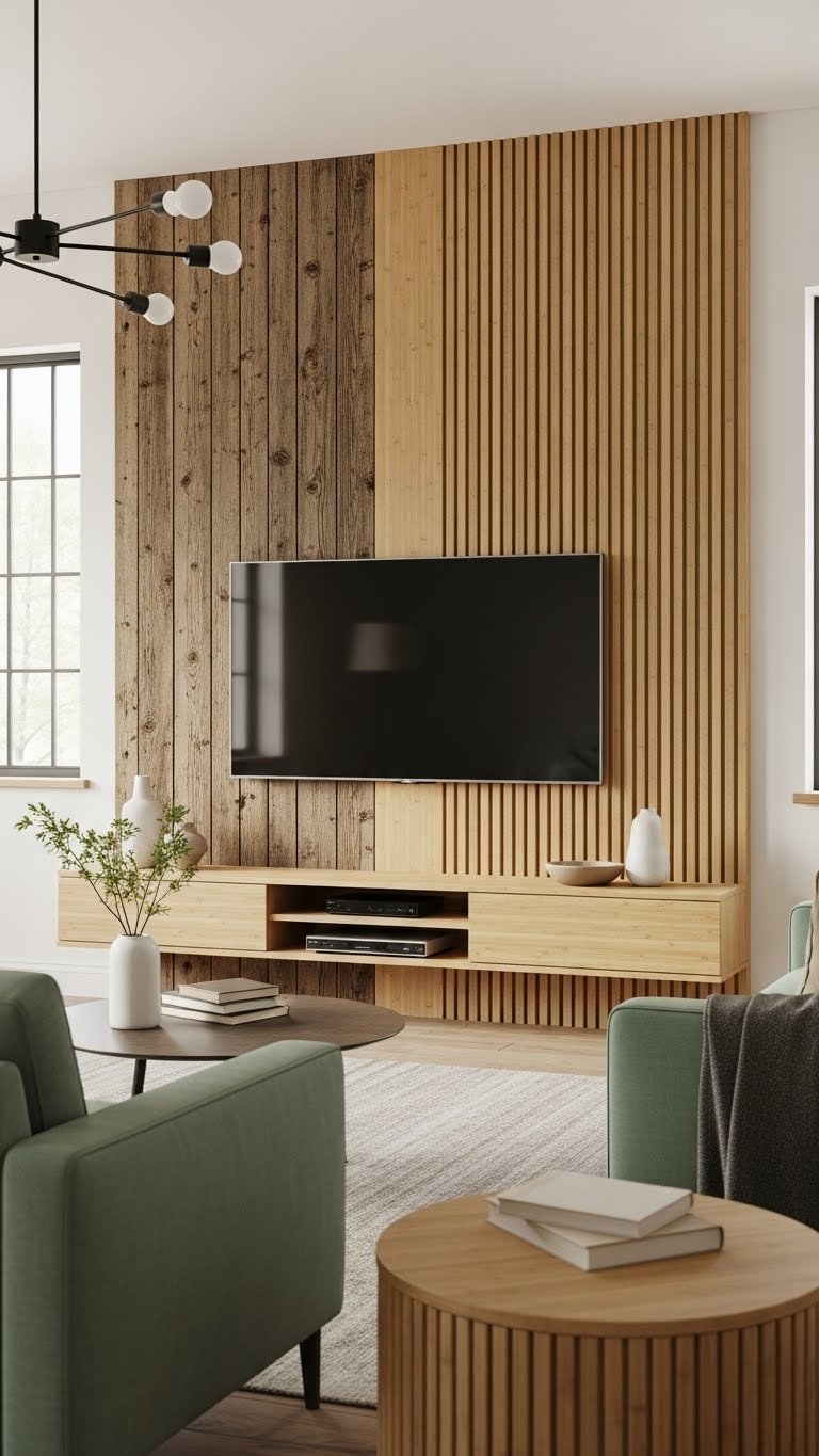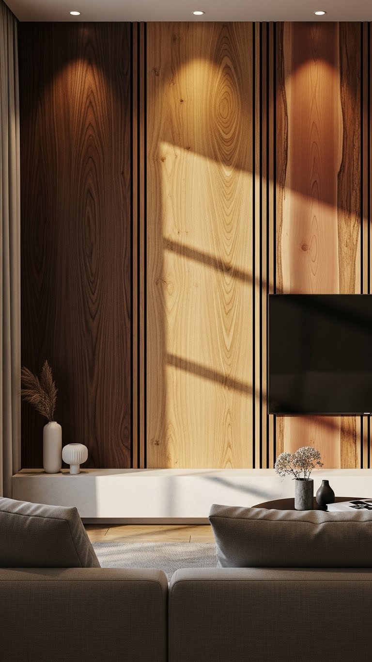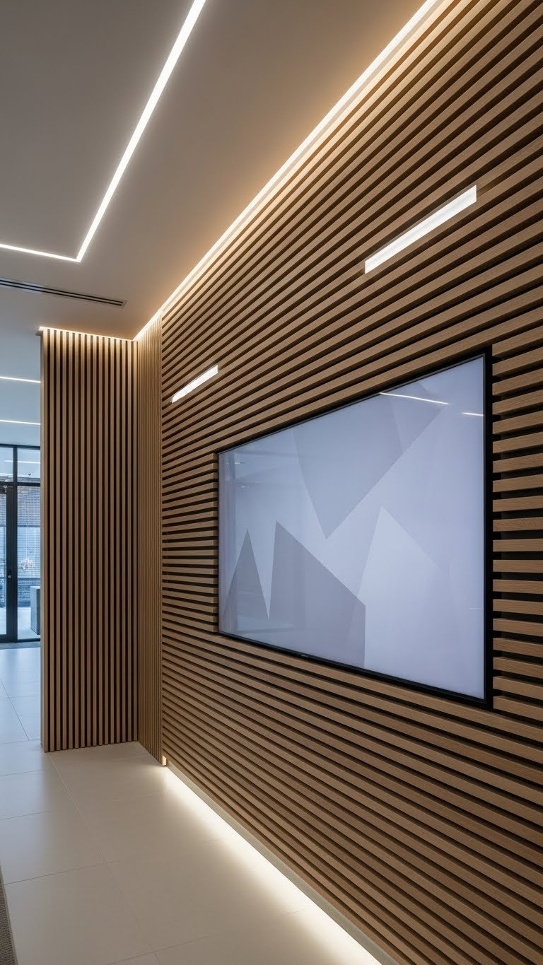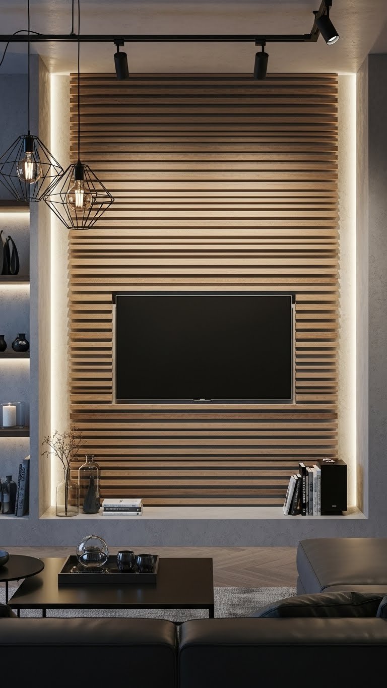Use ambient lighting to softly illuminate the wall’s texture, and incorporate accent lighting to highlight specific slats, creating depth and visual intrigue that’ll make your TV area feel intentionally designed.
