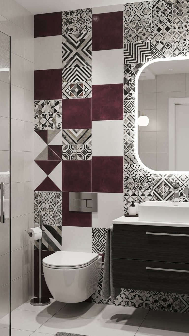 By blending diverse tile textures with warm wood accents and elegant stone elements, you’ll create a dynamic visual landscape that invites touch and relaxation.