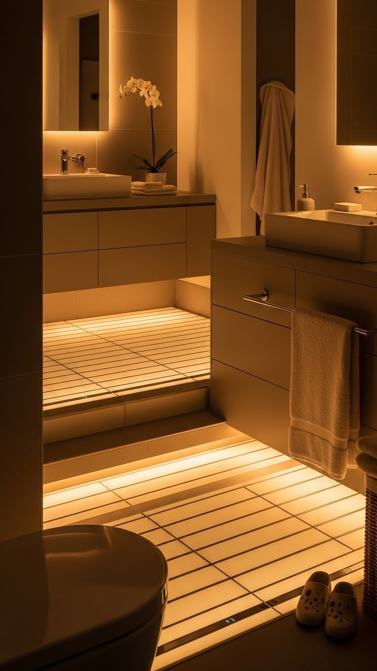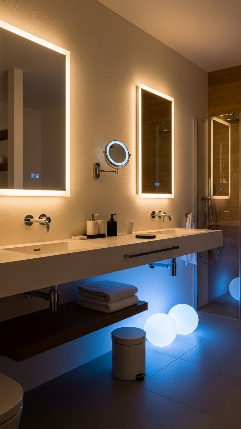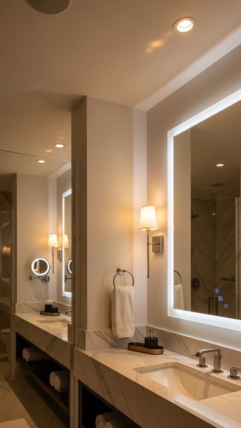 Strategic ambient lighting and functional fixtures transform your space, creating layers of illumination that balance mood and practicality, allowing you to design a bathroom that’s both inviting and efficiently designed.