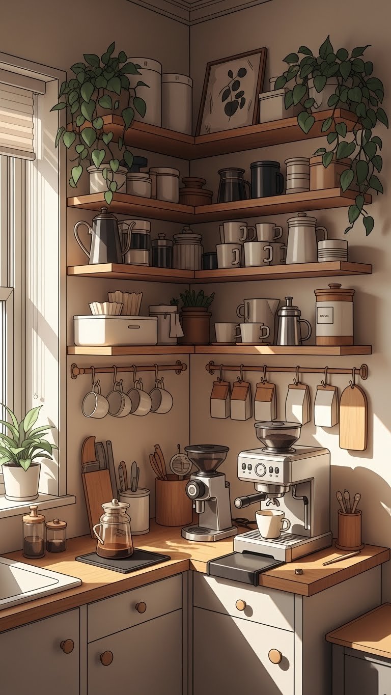 Leverage corner shelves and innovative space-saving solutions to craft your dream coffee zone.