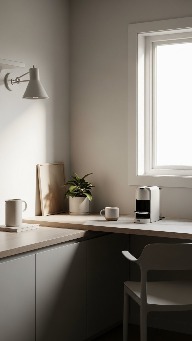 Beyond compact configurations, minimalist coffee corners represent a pure expression of design—where less truly becomes more.