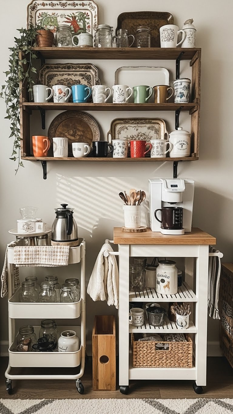 Repurpose old shelves for coffee mug organization, and consider a lightweight mobile coffee cart that rolls easily.