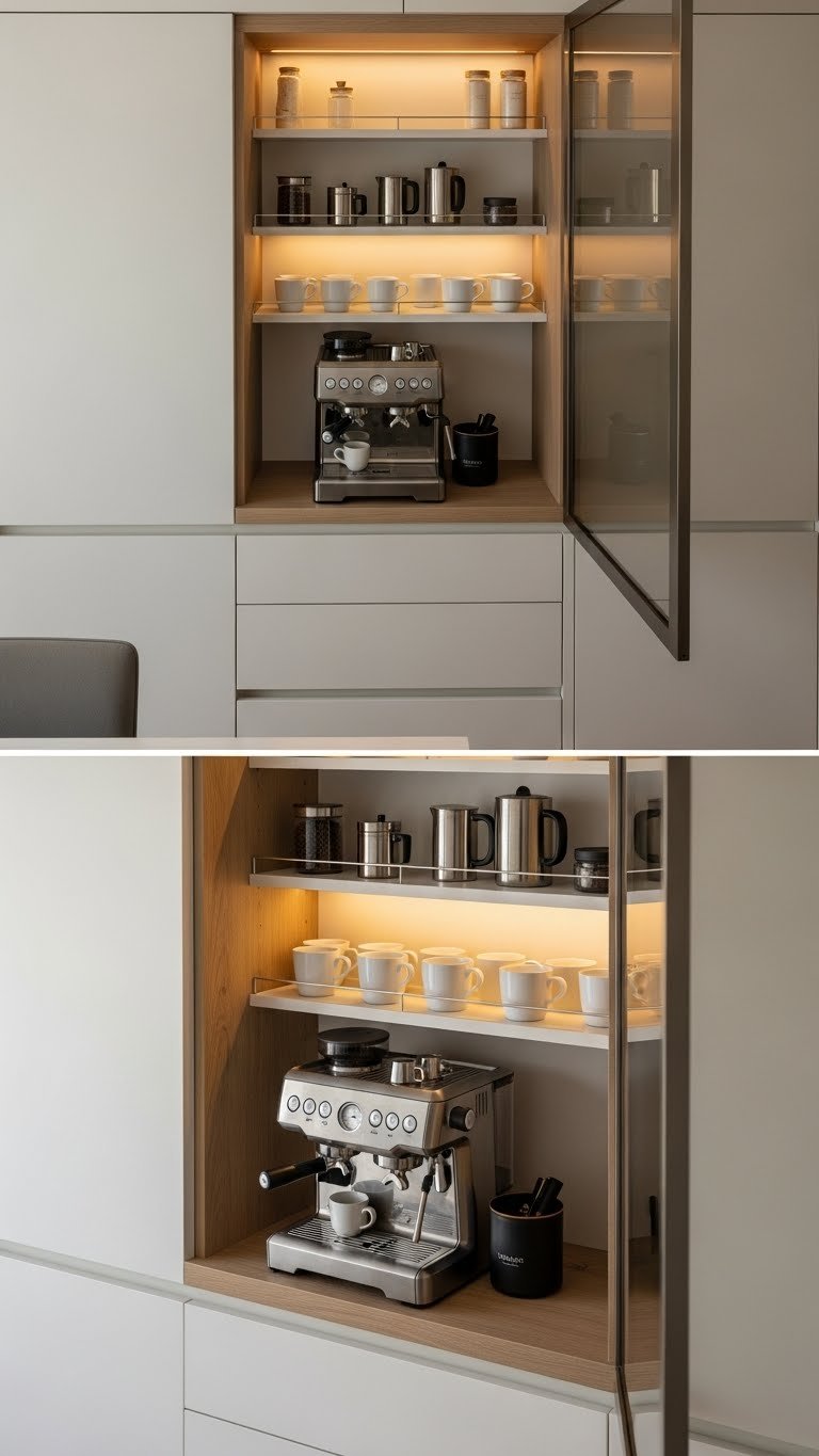 Tuck your espresso machine, mugs, and accessories into custom cabinetry that blends perfectly with your kitchen, creating an elegant, uncluttered coffee sanctuary.