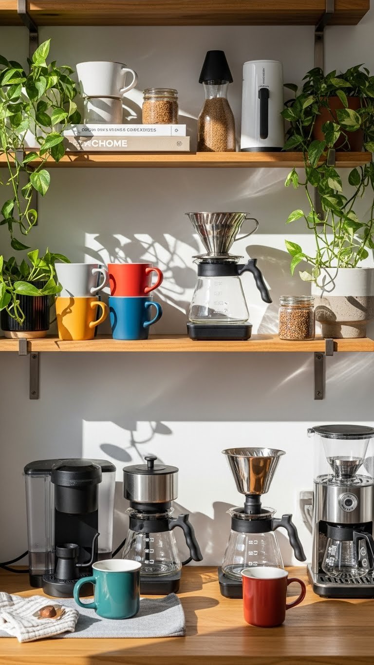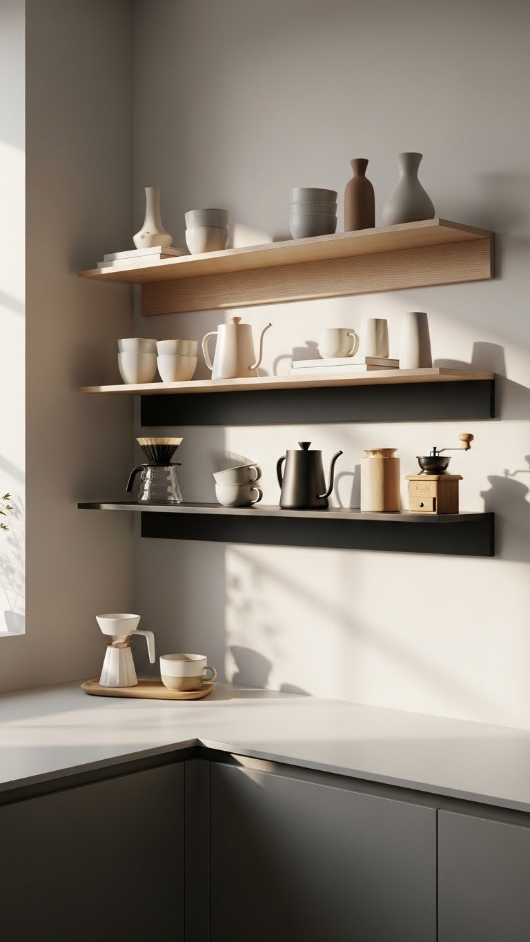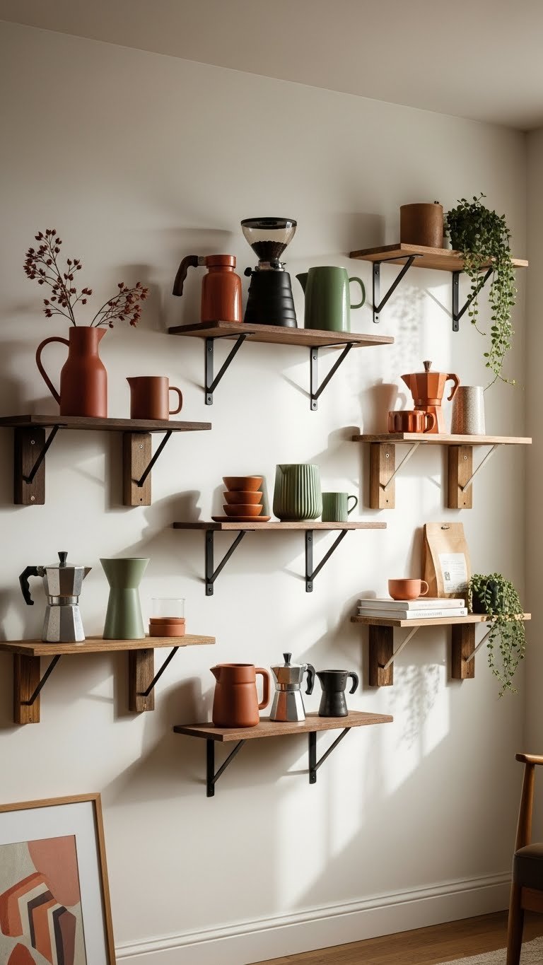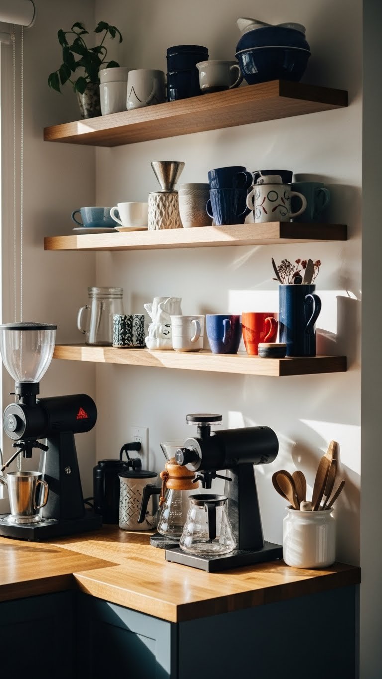 Smart shelf placement transforms your space from cluttered to curated, giving you the freedom to create a personalized coffee sanctuary.