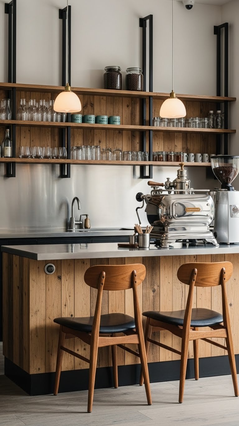 Industrial pragmatism meets rustic warmth in coffee corner design, where metal and wood converge to create a striking beverage station.