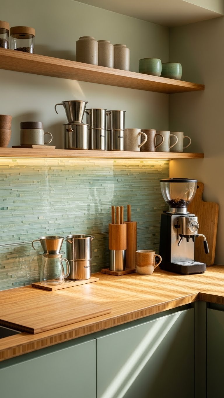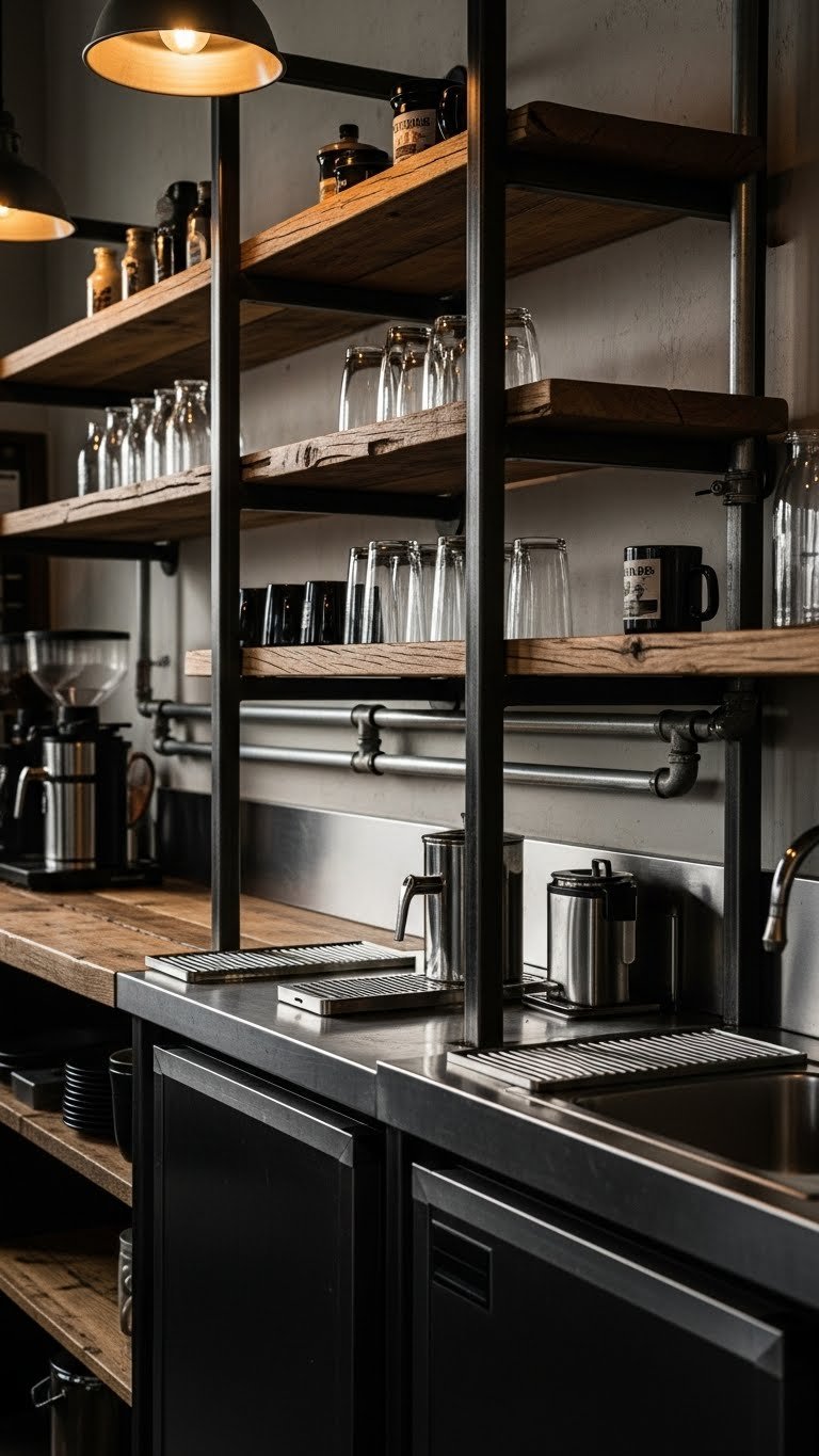 Open shelving transforms your coffee bar into a dynamic, visually accessible storage system that marries form and function.