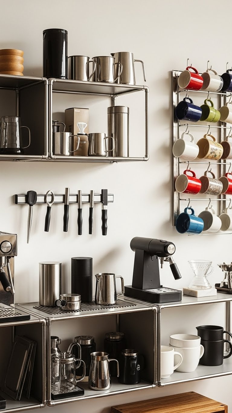 Maximize your coffee gadget organization with modular shelves, magnetic strips for tools, and hanging rack solutions.