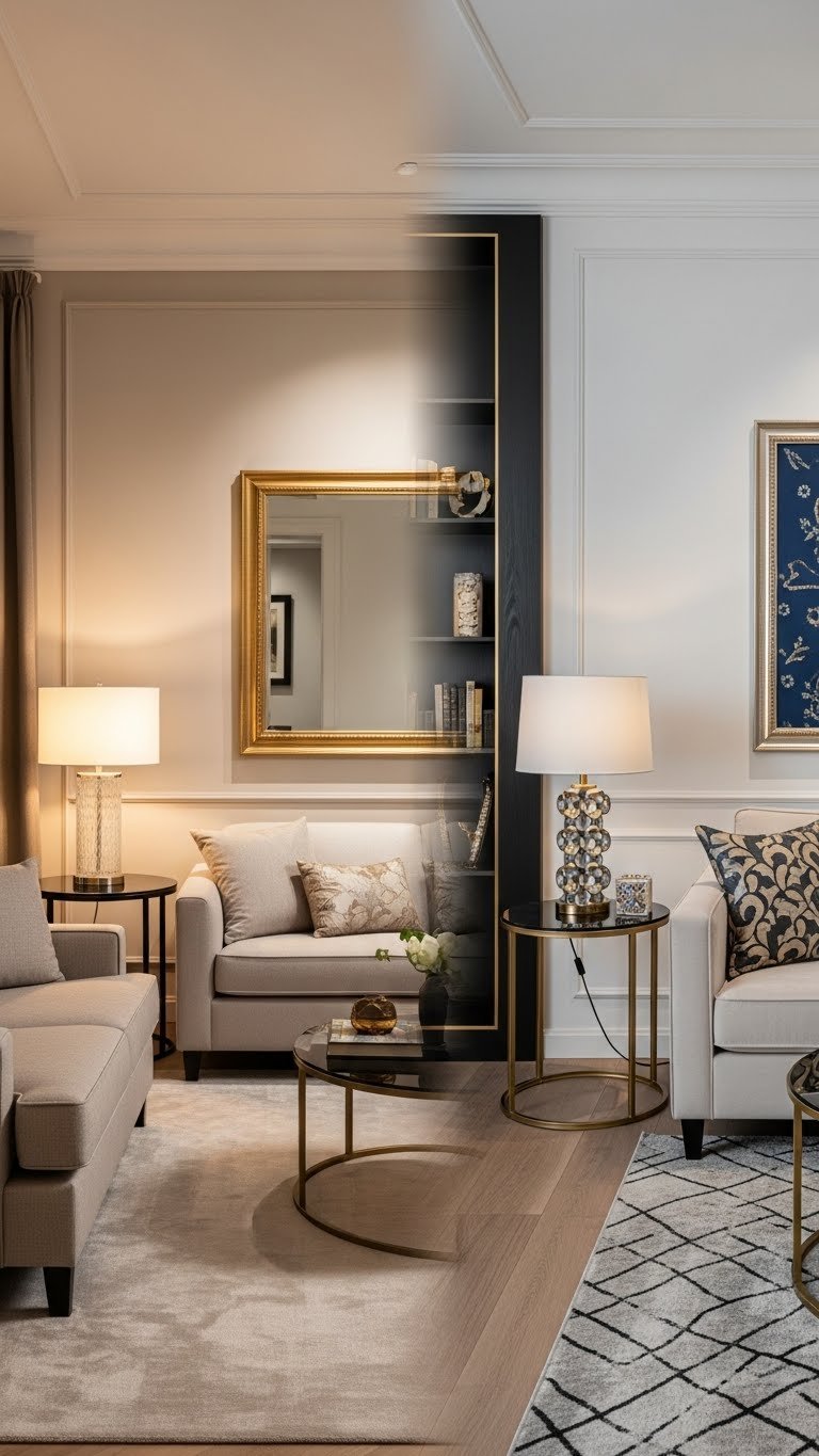 Gold accents and brass fixtures transform your space, adding warmth and luxury.