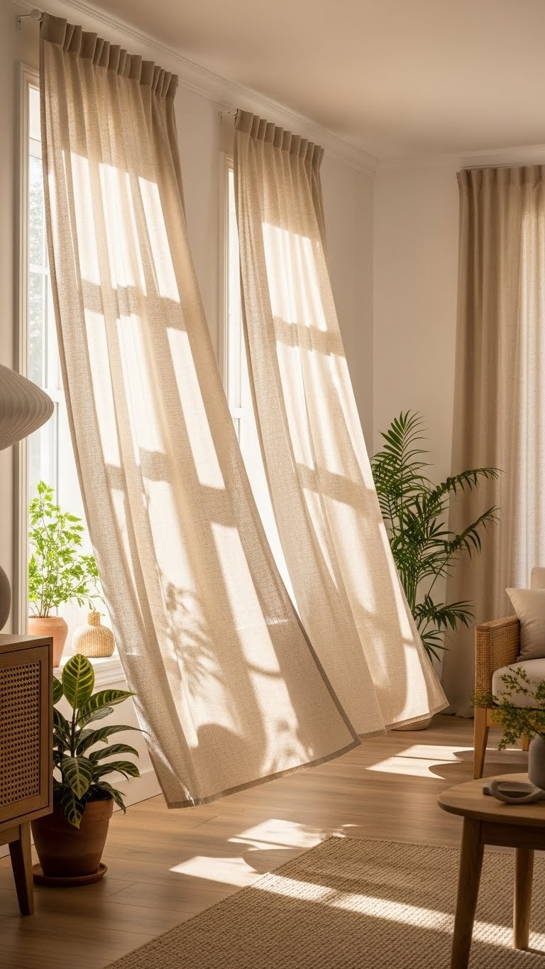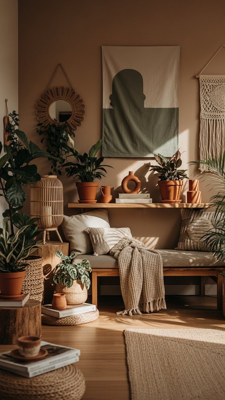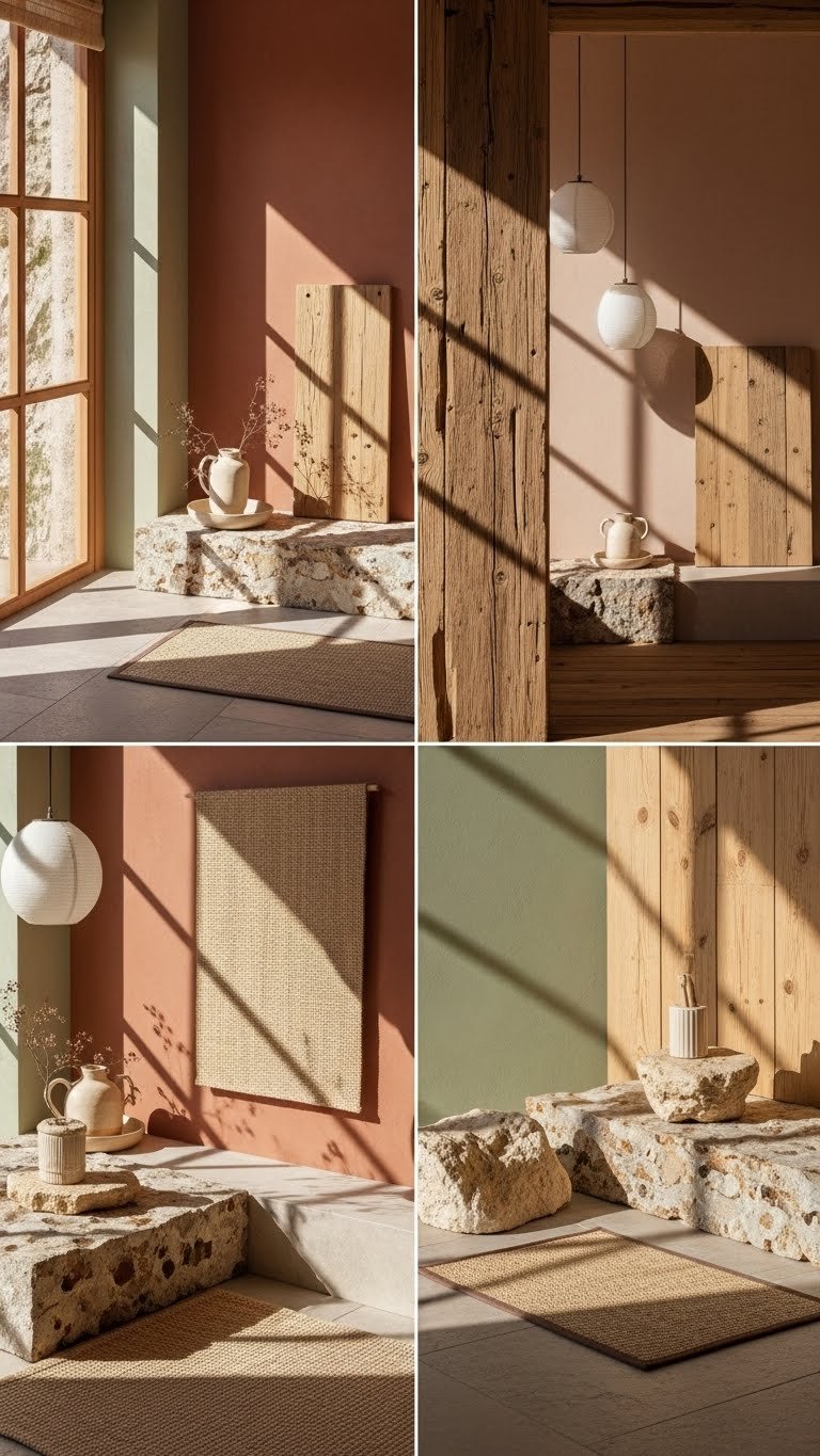 Incorporate calming textures like woven textiles and natural stone to amplify the organic aesthetic and invite peaceful energy.
