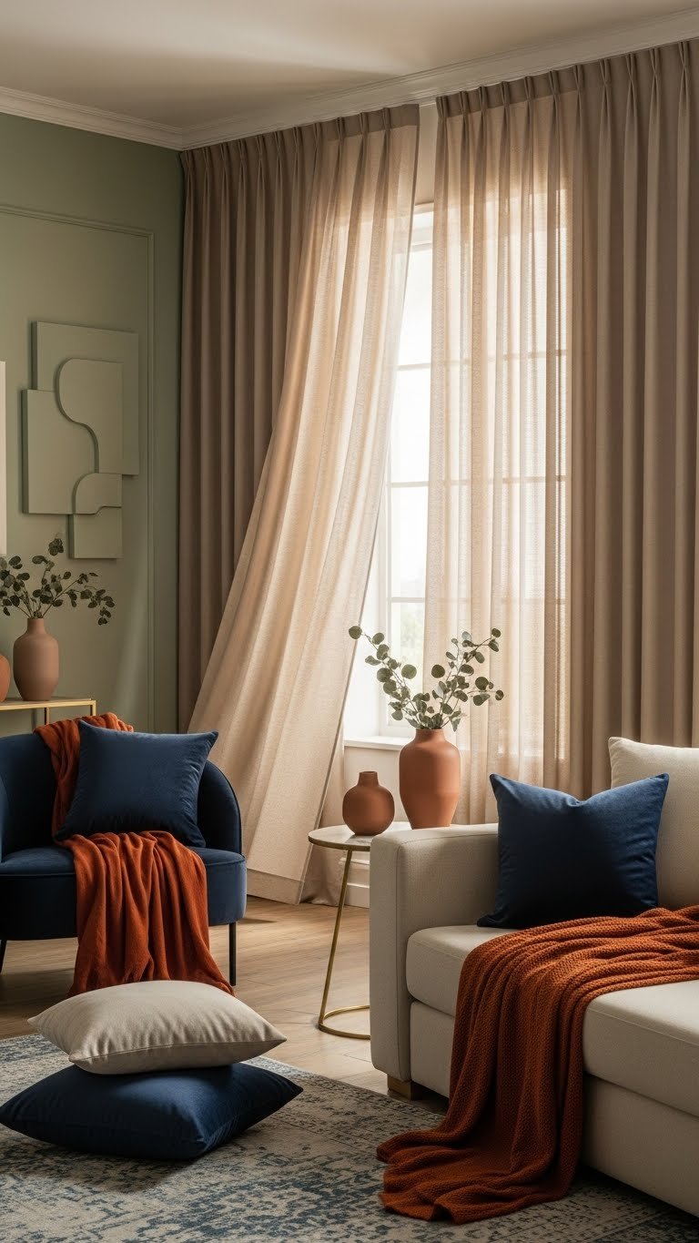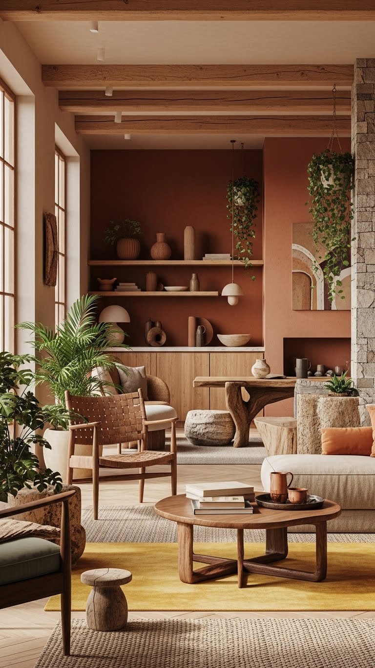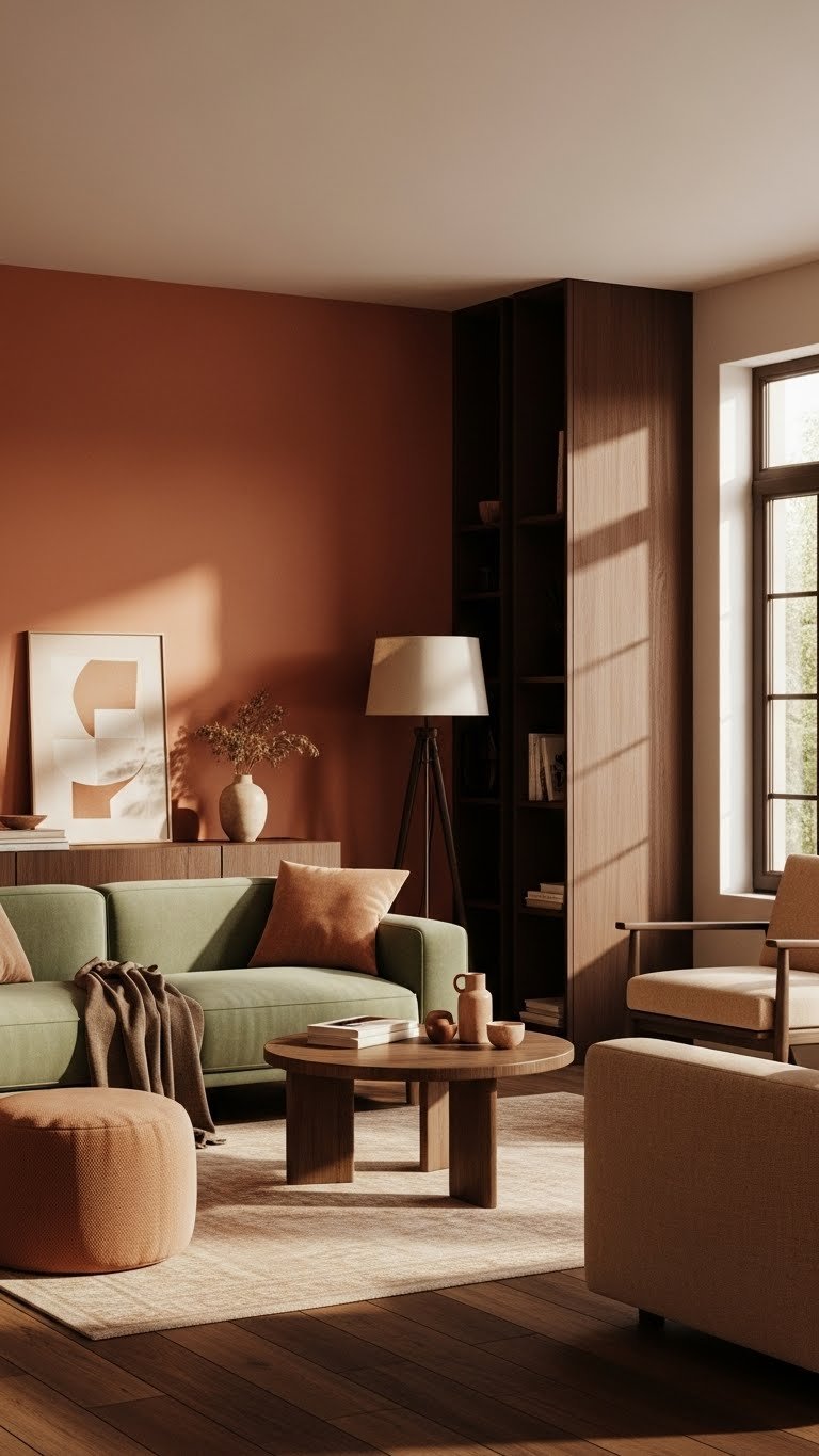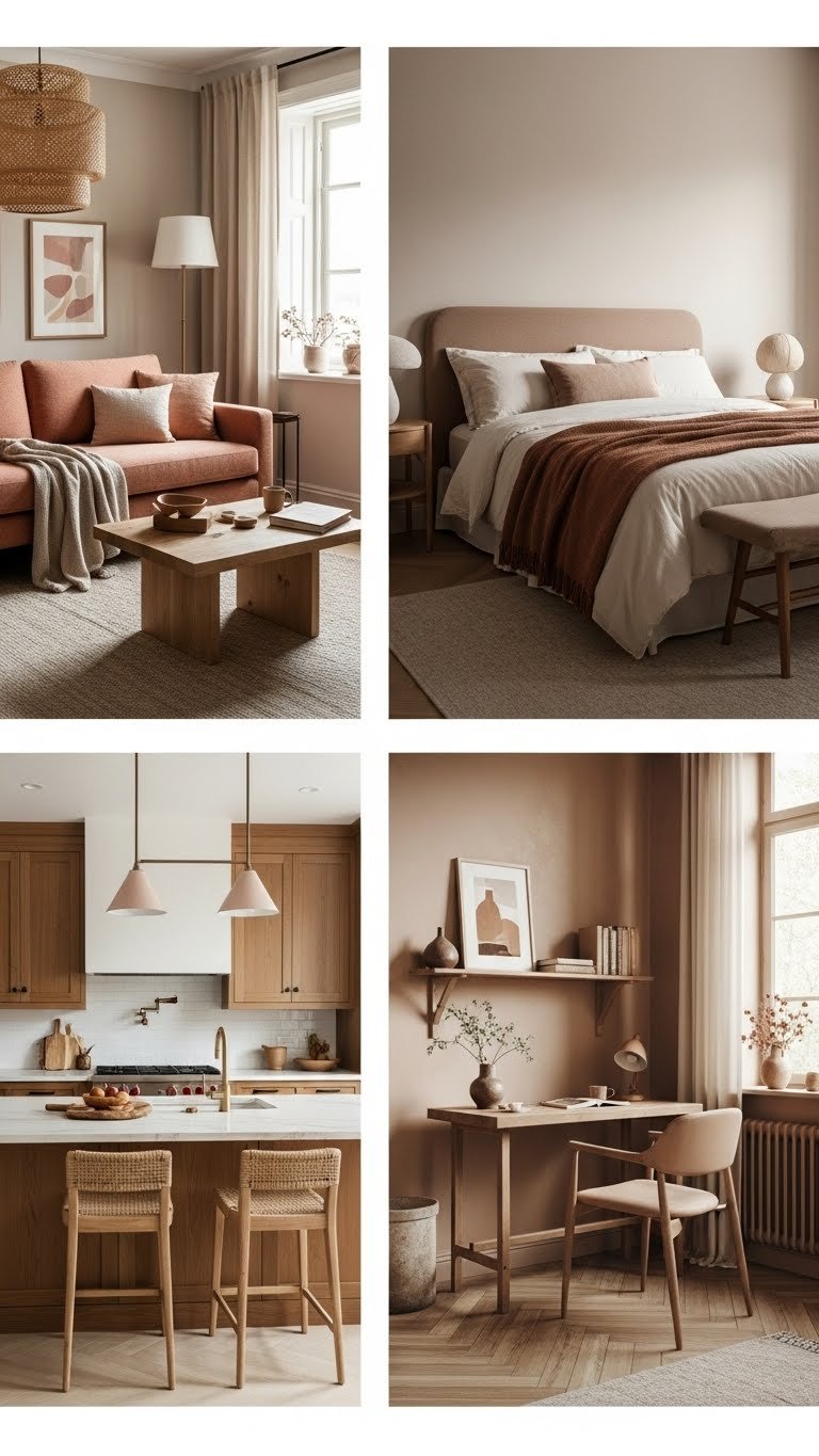 You’ll discover how warm terracottas, muted sage greens, and rich browns create grounding earthy accents that breathe calm into your home.